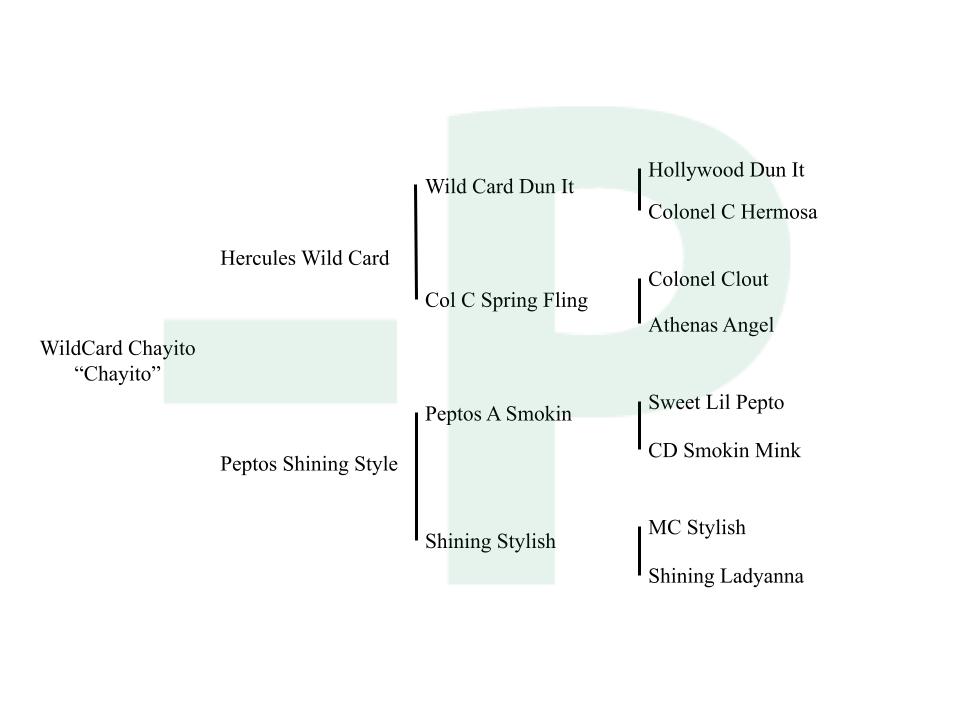 1st Dam: PEPTOS SHINING STYLE, by PEPTOS A SMOKIN, son of SWEET LIL PEPTO, son of PEPTOBOONSMAL, by CD SMOKIN MINK. With cutting and cow horse versatility bloodlines.